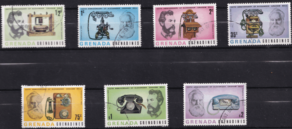 Grenada Grenadines – 1977 – serie over 100 jaar Alexander Graham Bell. Nominale waardes ½ – 1 -2 – 35 en 75 cent en 1 en 2 Dollar. Michel nummer 209#215 Cataloguswaarde gebruikt nihil. Afgebeeld telefoons van antiek tot modern (1963) met afgewisseld een jonge en een oudere Graham Bell.